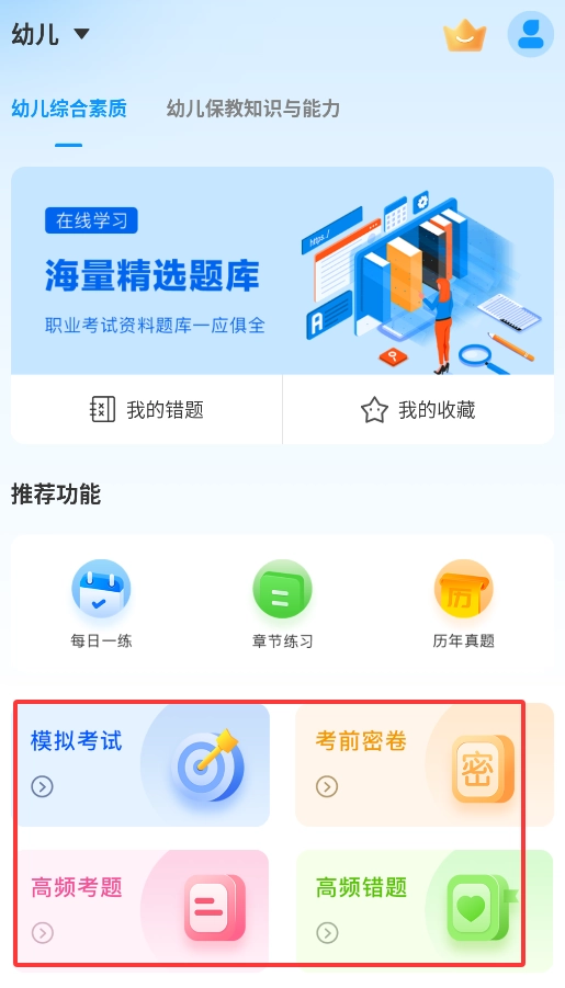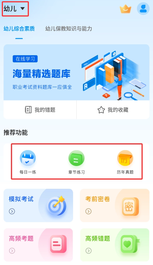 2.以幼儿教师资格为例,题库分为"综合素质"和"保教知识"两大部分,提供每日练习、分章节训练和历年真题三种学习模式
