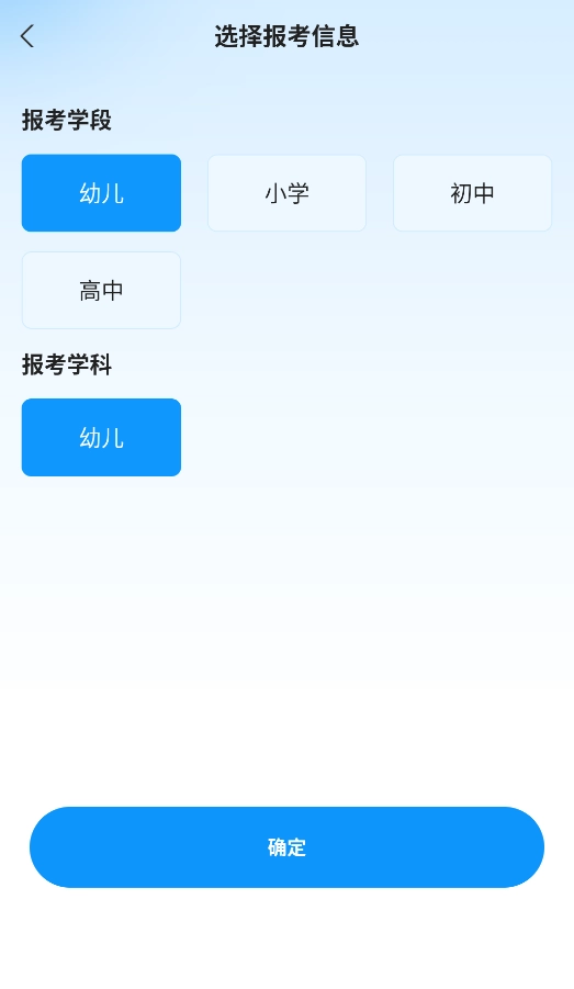 1.打开教资刷题通App,首先选择报考学段(幼儿/小学/初中/高中等),系统会根据选择自动匹配对应题库