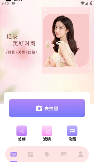 1、在首页中提供了拍照的功能,同时还有美颜、滤镜及修图的功能;