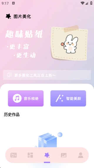 3、图片美化,提供趣味贴纸、音乐相册、智能美颜,激发创作想象。