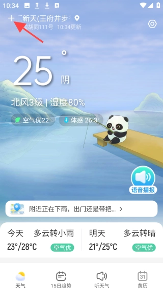 2. 打开【天气】界面,查看所在地的天气情况,点击【+】图标。