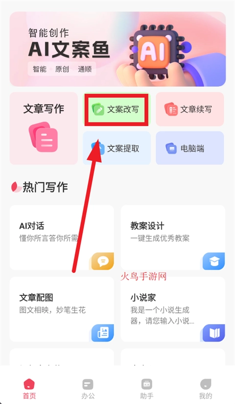 开启AI文案鱼应用程序,当进入首页界面时,轻点文案改写选项。