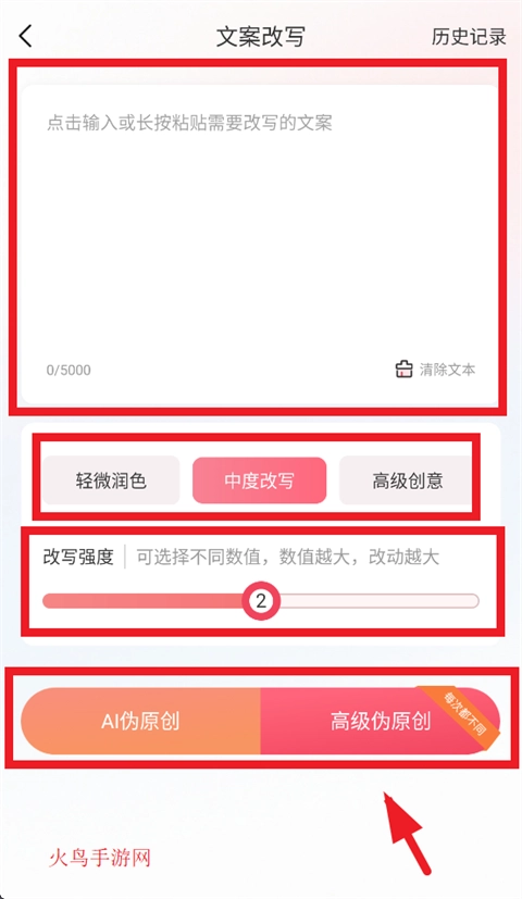 当您进入文案改写界面,既可以输入需要改写的文案,也能长按粘贴。接着,选定改写需求,然后点击AI伪原创或者高级伪原创,就可以完成操作啦。