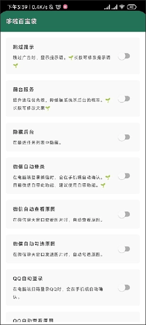 7、在这个哆啦百宝箱内我们可以设置跳过提示、前台服务、qq自动登录等等的功能,我们只需要把功能后面的开关打开就可以了。
