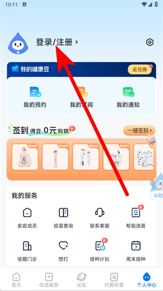 1. 开启约苗应用,进入到首页界面,轻点底部导航栏最右边的个人中心选项。