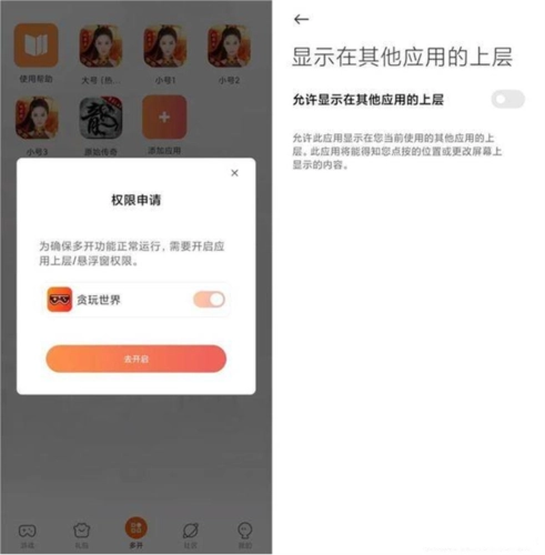 多开功能所需权限不多,任何人都能轻松快速上手。使用该功能时,需在手机设置中将“贪玩世界”应用置于最上层,不然出现的窗口无法悬浮且无法持续运行,进而会造成账号掉线。
