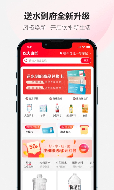 送水到府是一个预约订购农夫山泉的客户端平台,专为广大消费者提供订水服务,配送订水服务便捷快速。不仅送水上门、免费配送,最快2小时就能送达,还提供多种送水服务选项,像大包装水、小包装水、饮品、食品等。平台设有购物商城,品类十分丰富。新用户可享受优惠券,还有各类丰富的优惠活动。