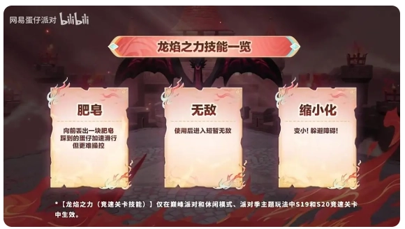 【龙焰之力(竞速关卡技能)】仅在巅峰派对、休闲模式以及派对季主题玩法里的S19和S20竞速关卡中发挥作用。