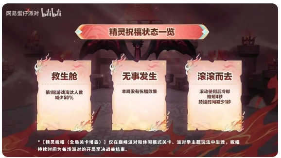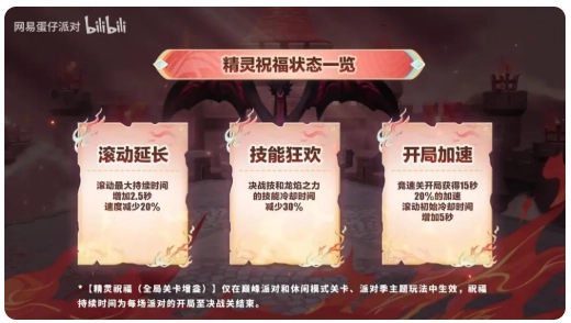 【精灵祝福(全局关卡增益)】仅在巅峰派对、休闲模式关卡以及派对季主题玩法里生效,祝福的持续时间是从每场派对的开局一直到决战关结束。