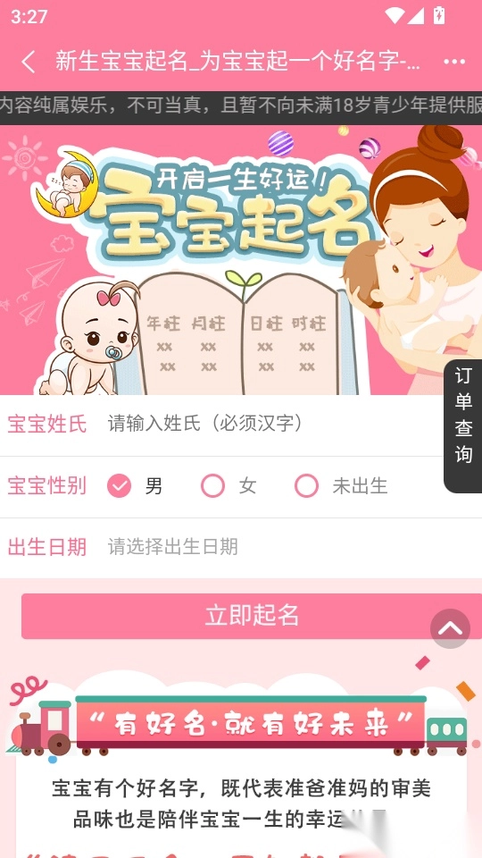 4. 最后,大家在输入宝宝的姓氏、性别、出生日期后,点击“立即起名”按钮,即完成操作。