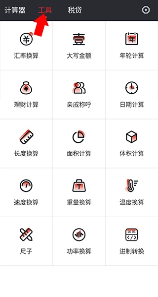 2. 点击上方导航栏里的工具选项,便能切换至工具菜单。该菜单为用户提供诸多功能,包括房贷计算、汇率换算、阿拉伯数字转中文大写、年轮计算、理财计算、亲戚称呼计算、长度换算、面积计算以及体积计算等。