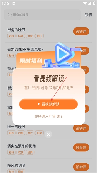 4、当弹出看视频解锁的弹窗时,点击【看视频解锁】按钮,观看广告完毕,就能永久解锁该铃声。