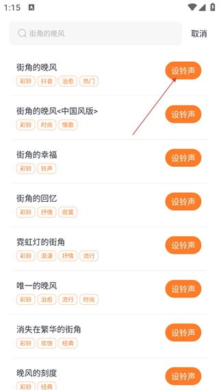 3、于搜索结果页面,寻觅到目标铃声(例如【街角的晚风】),而后点击【设铃声】按钮。
