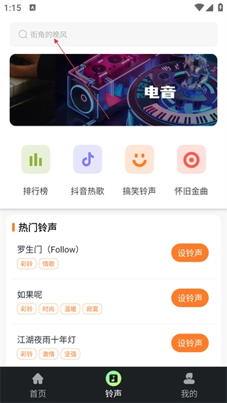 2. 在铃声页面的搜索框中,输入你想要的铃声名称(例如【街角的晚风】),随后进入搜索结果页面。