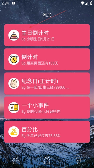 2. 在添加页面,选中【生日倒计时】类型,从而进入新建生日倒计时页面。