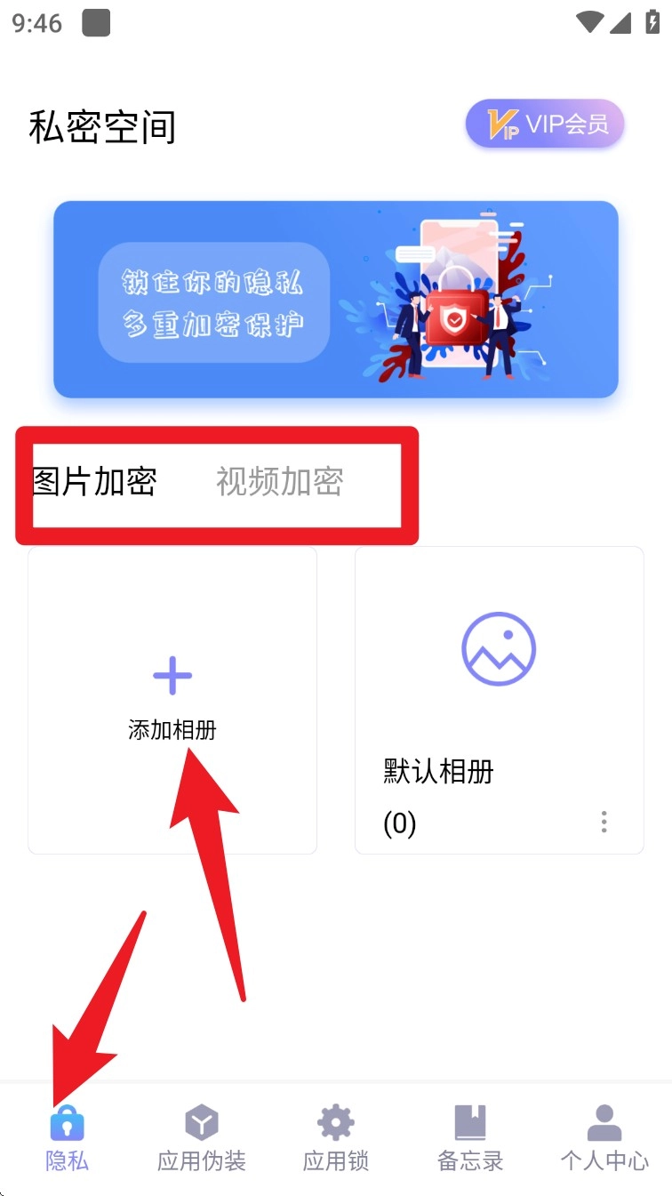 2. 找到底部菜单中的隐私页签并进入,点击“添加相册”,就能对想要隐藏的图片进行加密储存。