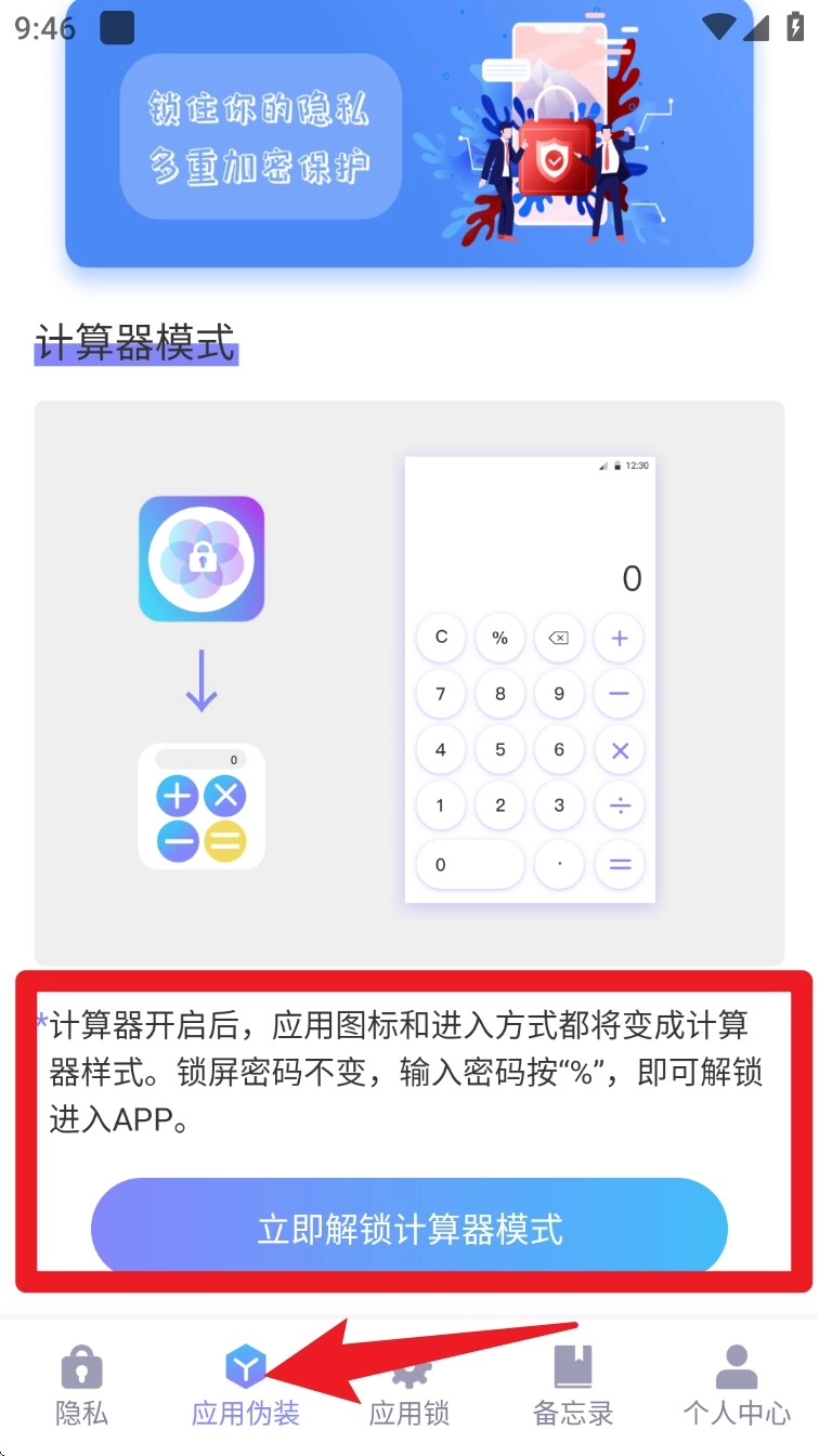 3. 进入应用伪装功能,把App图标伪装成计算器,输入密码后按下%就能解锁。