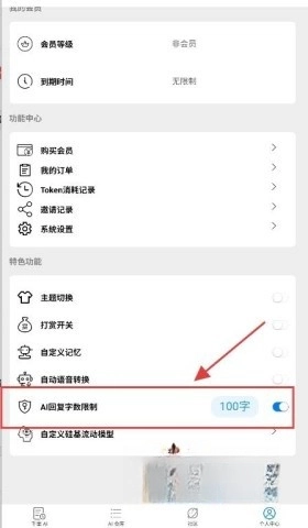 1、于个人中心内寻觅AI回复字数限制这一选项。