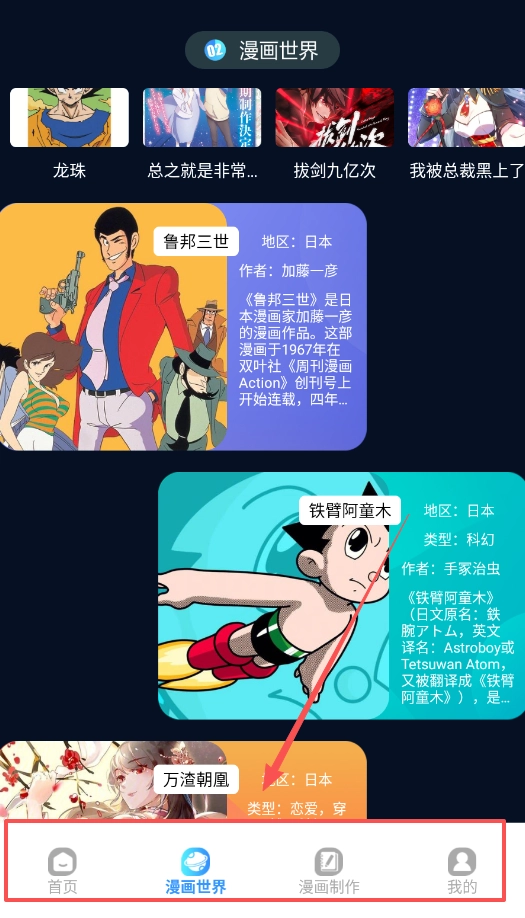 2、随后畅游漫画天地,在《龙珠》《我被总裁黑上了》等作品间穿梭,借助简洁明了的信息介绍,快速挑选下一本读物。