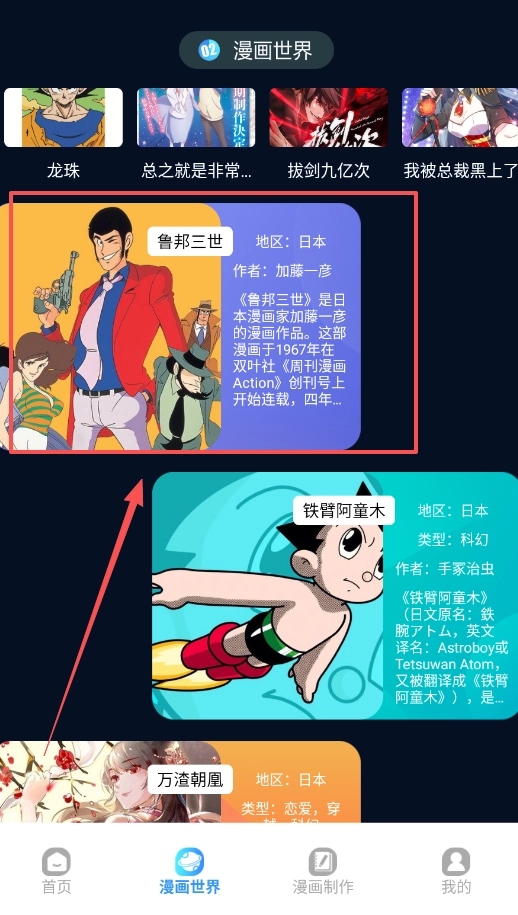2、接下来进入探索漫画世界的环节,这里涵盖铁臂阿童木、我被总裁黑上了等诸多丰富资源,点击查看详情,便可深入知晓作品的背景信息。