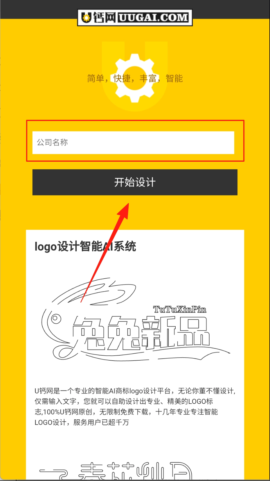 1、在本站u钙网进行logo免费设计时,输入公司名称,然后点击开始设计。