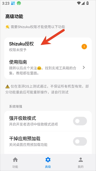 3、若要使用一些高级功能,用户需前往Shizuku进行授权,并获取adb调试权限。授权方式十分简便,在玄戒工具箱的高级界面直接点击Shizuku授权就能完成。