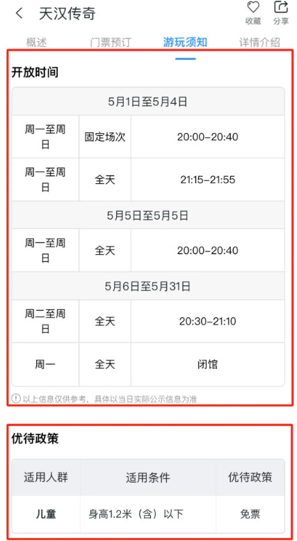 进入门票页面,可以查看景区开放时间、优待政策和详情介绍。
