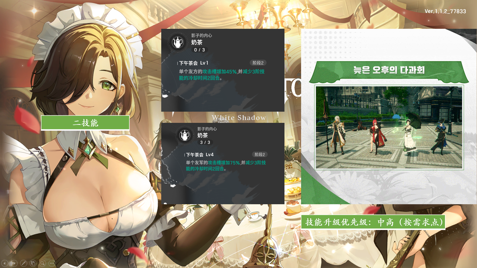 二技能:是个对友军使用的单体拉条技能,最多可以拉75的行动条,并且减少S3技能冷却2回合,这个技能算是戴安娜PVE中的核心技能,可以让自己的主C,高频率使用大招,与此同时带来的问题就是必须绑定水辅这种回MP的角色,甚至还是会出现MP不够用的情况。升级技能拉条的提升还是比较多的,不过还是得看自己的阵容配速,目前按照需求升级技能,够用就行。