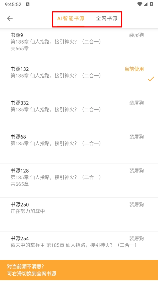3图中界面整合了AI智能书源与全网络书源资源,您只需挑选并点击对应的书源选项,就能完成切换操作。