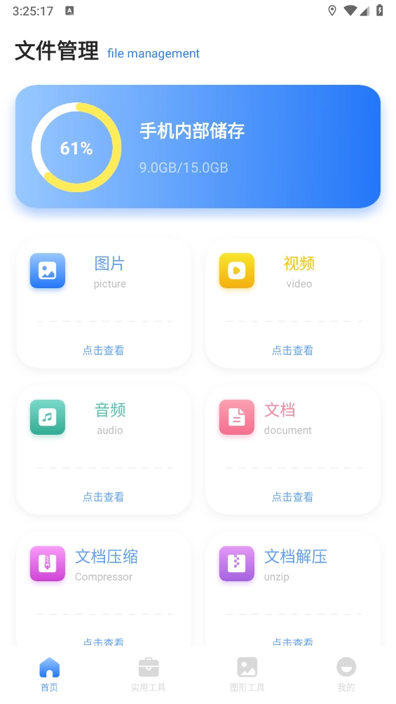 1、打开应用进入首页,就能查看手机内部存储、图片、音频、文档压缩等各类资源。