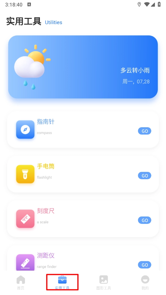 2进入实用工具界面,这里整合了指南针、手电筒、放大镜等常用功能工具。