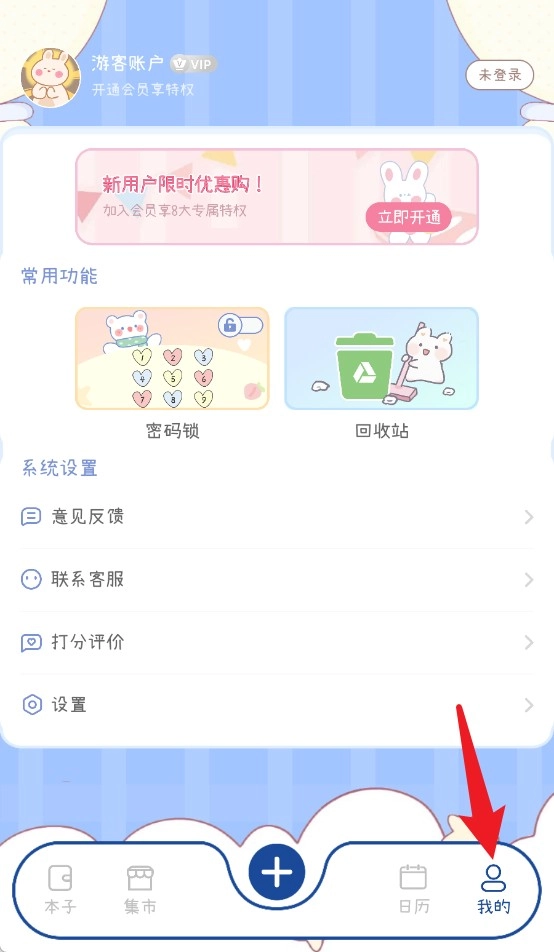 5进入个人中心的入口是点击“我的”,在这里可以完成多项操作:设置密码锁保障账户安全,查看回收站里的内容,提交意见反馈,以及进行账号相关的设置调整。