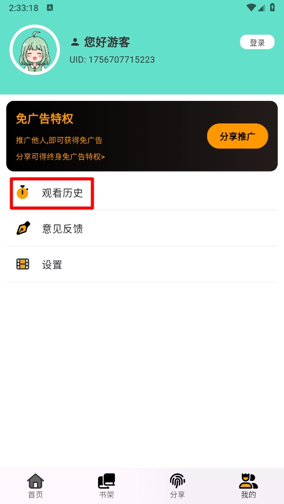 2、然后在我的页面点击"观看历史"进入。