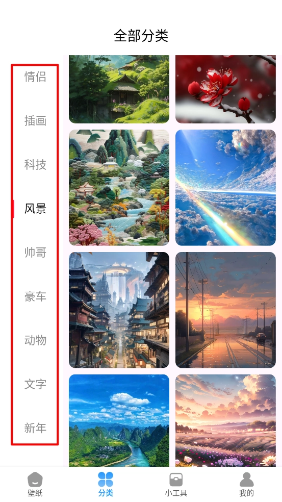 3、壁纸分类丰富多样,涵盖心灵鸡汤、科技、梦幻等多种类型,帮助用户快速找到符合