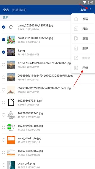 3、选好图片后,点击右上角的三个点打开下拉菜单,再点击压缩功能。