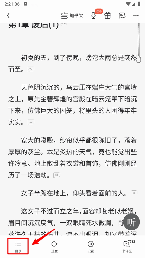 5最后,可进入阅读页面,轻点屏幕中间位置调出功能栏,再点击左下角的“目录”选项来浏览内容。