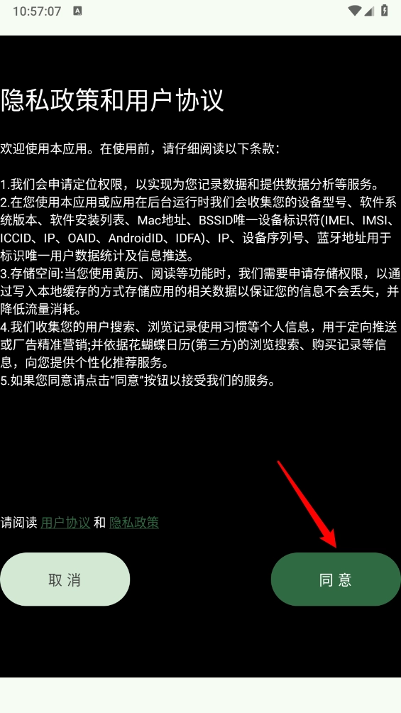 1、用户在安装软件,同意相关权限和隐私政策。