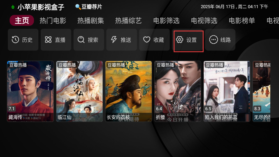 1、进入小苹果影视盒子之后,点击首页的“设置”。