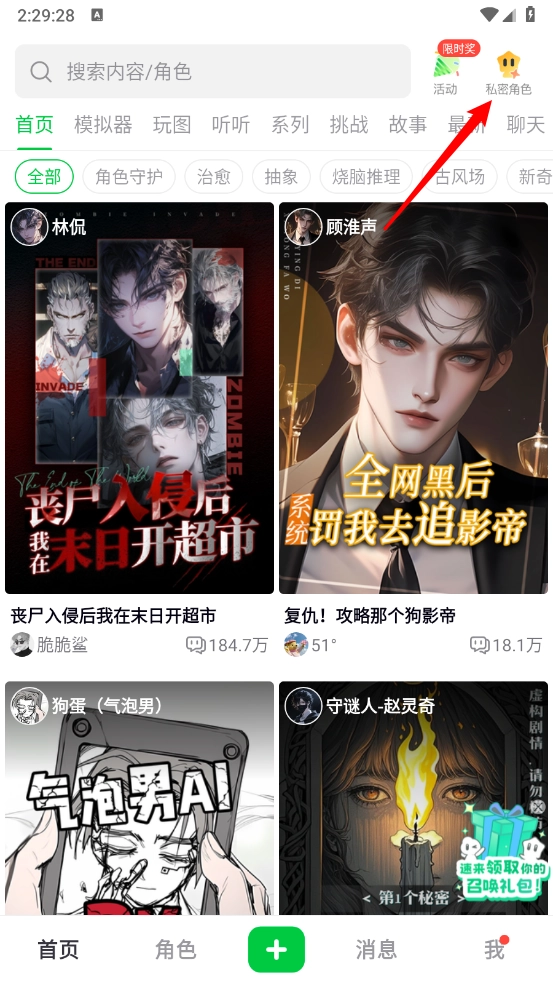 2、在主页点击"私密角色",如图所示。
