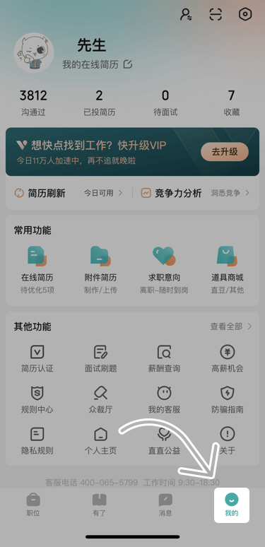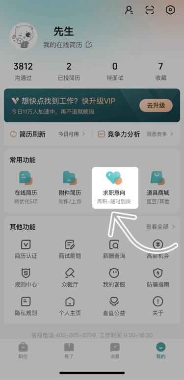 2、点击求职意向。