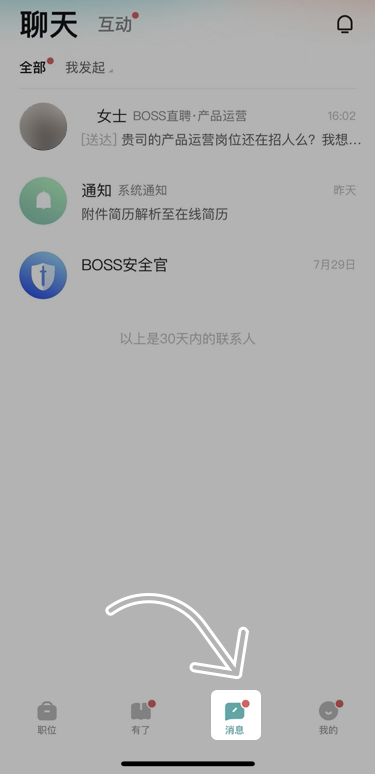 1、进入boss直聘,点击消息。