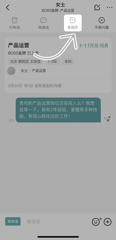 2、进入与招聘者的聊天页面。
