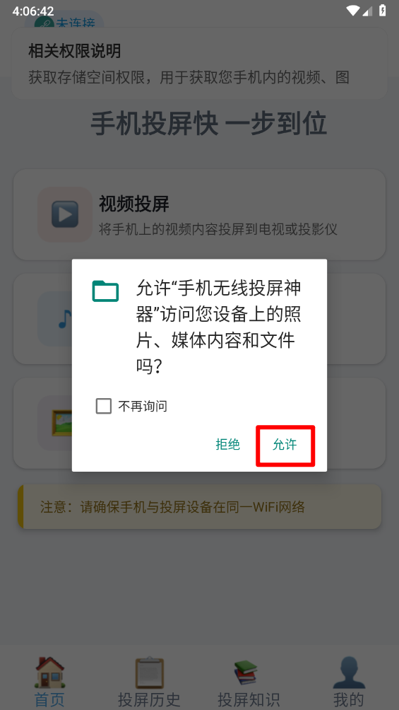 3、以"视频投屏"为例,一键打开,"允许"相关权限进行访问。
