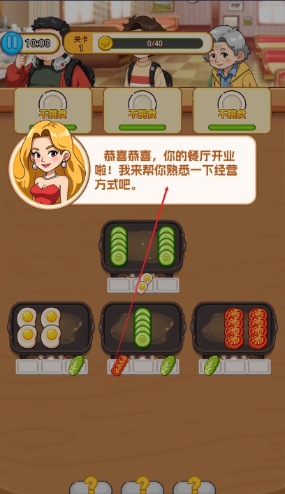 1、一款模拟烧烤店经营的游戏,每天必须接待一定数量的顾客,采用消除玩法,将相同的烧烤食材摆放在烤盘上。