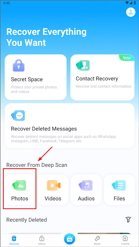 1、打开Dr.Fone安卓版,点击下方Photos;