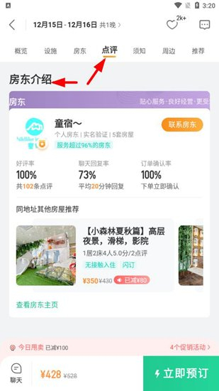 1. 第一步,要进入你打算分享房源的详情页面。随后,挑选【点评】这一标签。紧接着,直接点击房东。