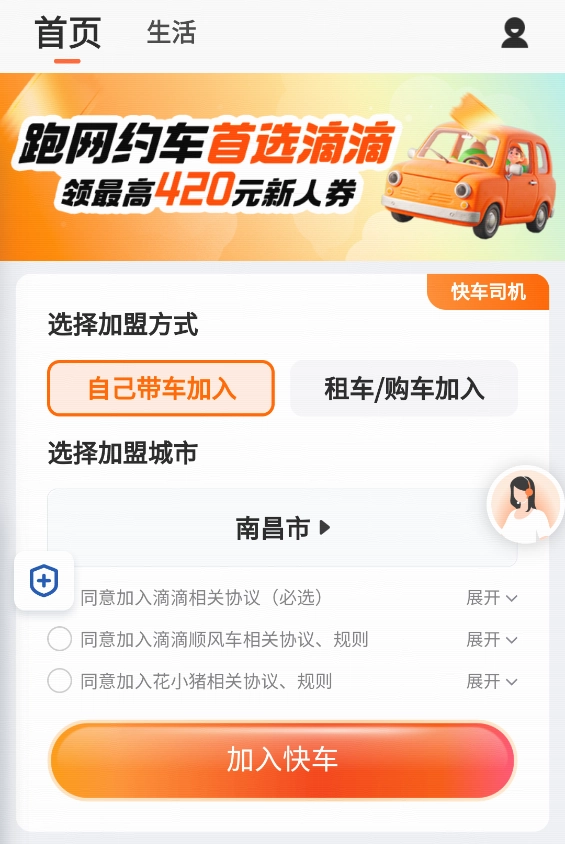 3、我们以快车为例,选择你的加盟方式和加盟城市,然后同意下面三个规则,点击加入快车。
