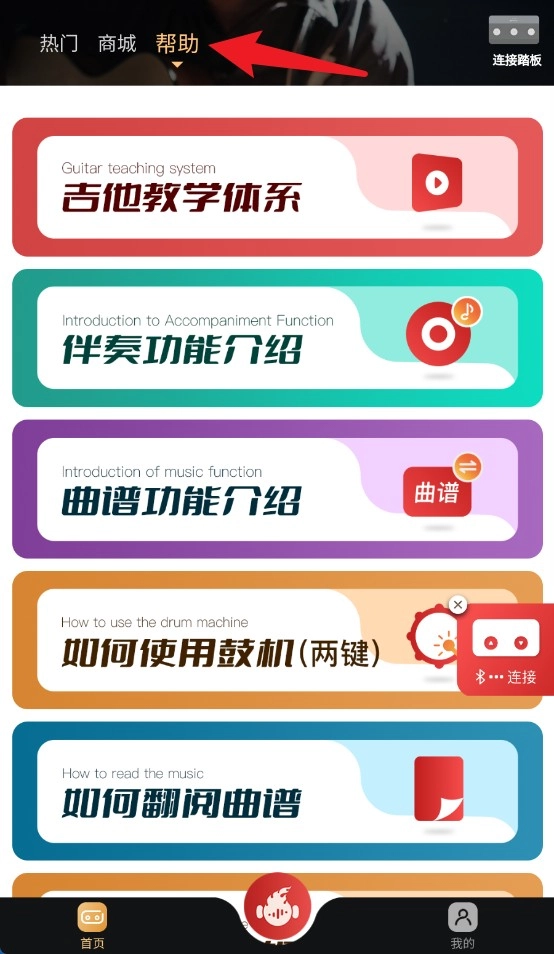 3、点击顶部的“帮助”选项,即可查看吉他教学、鼓机使用等各项功能的详细说明,能帮助新手快速熟悉并掌握操作。
