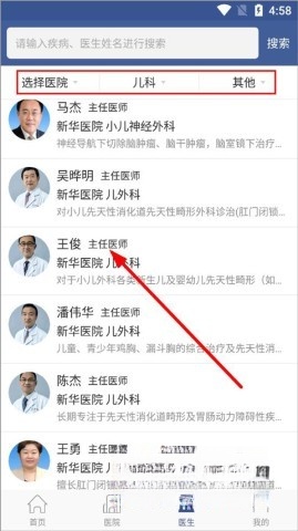 2进入挂号预约界面后,可通过医院名称、科室分类或医生姓名进行挂号检索,选中对应医生即可查看其详细信息。