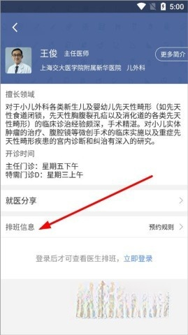 3、进入页面后,能看到医生的基本信息、擅长治疗领域、开诊时间和排班信息。点击查看排班信息,依据这些内容选择就诊时间、添加就诊人,完成挂号费支付后即可挂号成功。